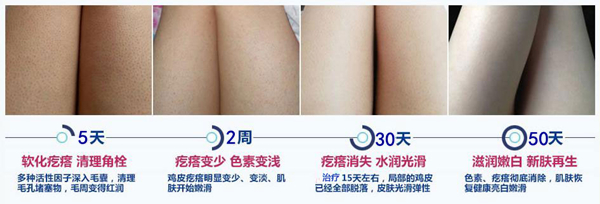 鸡皮肤到了60天后重度鸡皮肤淡化,巩固5-10天后皮肤光滑。